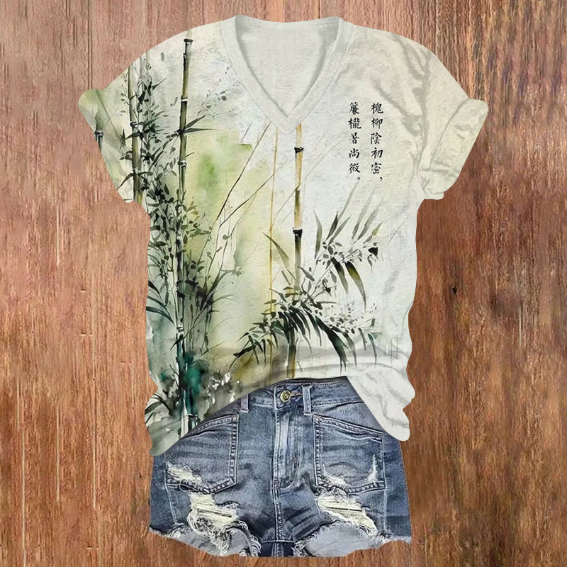 Vintage Zen-inspired Bamboo Ink Painting Pattern Print Short Sleeved V-neck T-shirt
