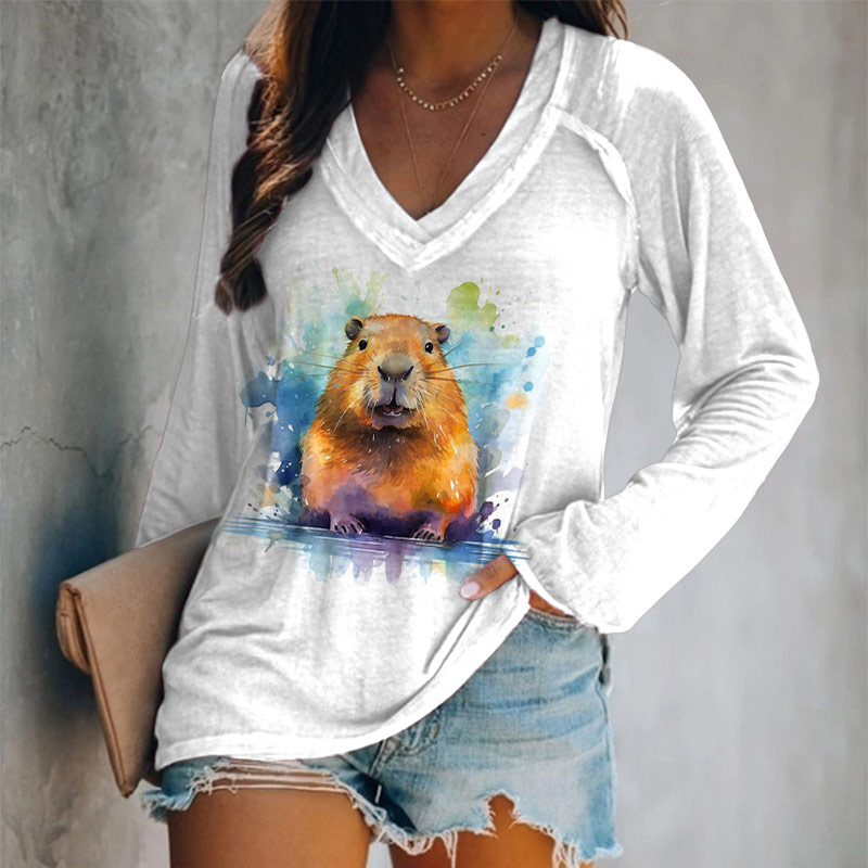 Dashingsoul Capybara Watercolor Print Long Sleeve V-neck T-shirt