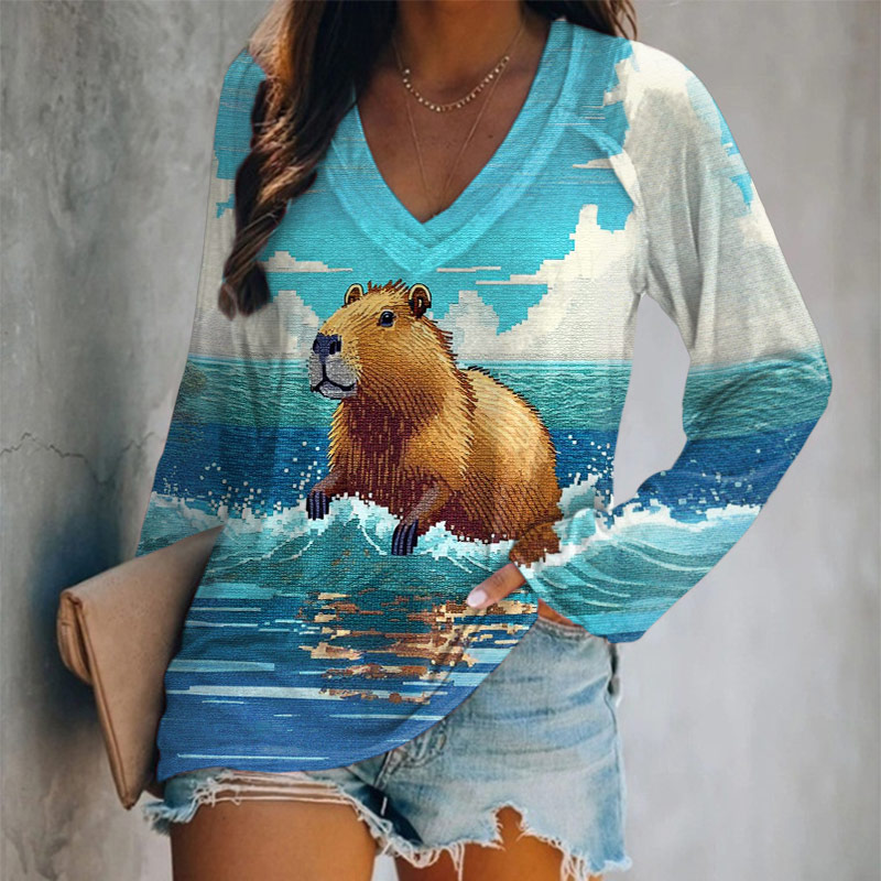 Dashingsoul Surfing Capybara Watercolor Print Long Sleeve V-neck T-shirt