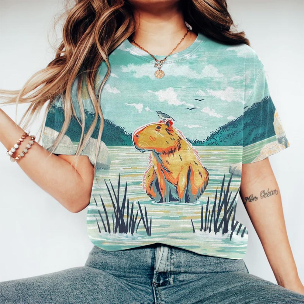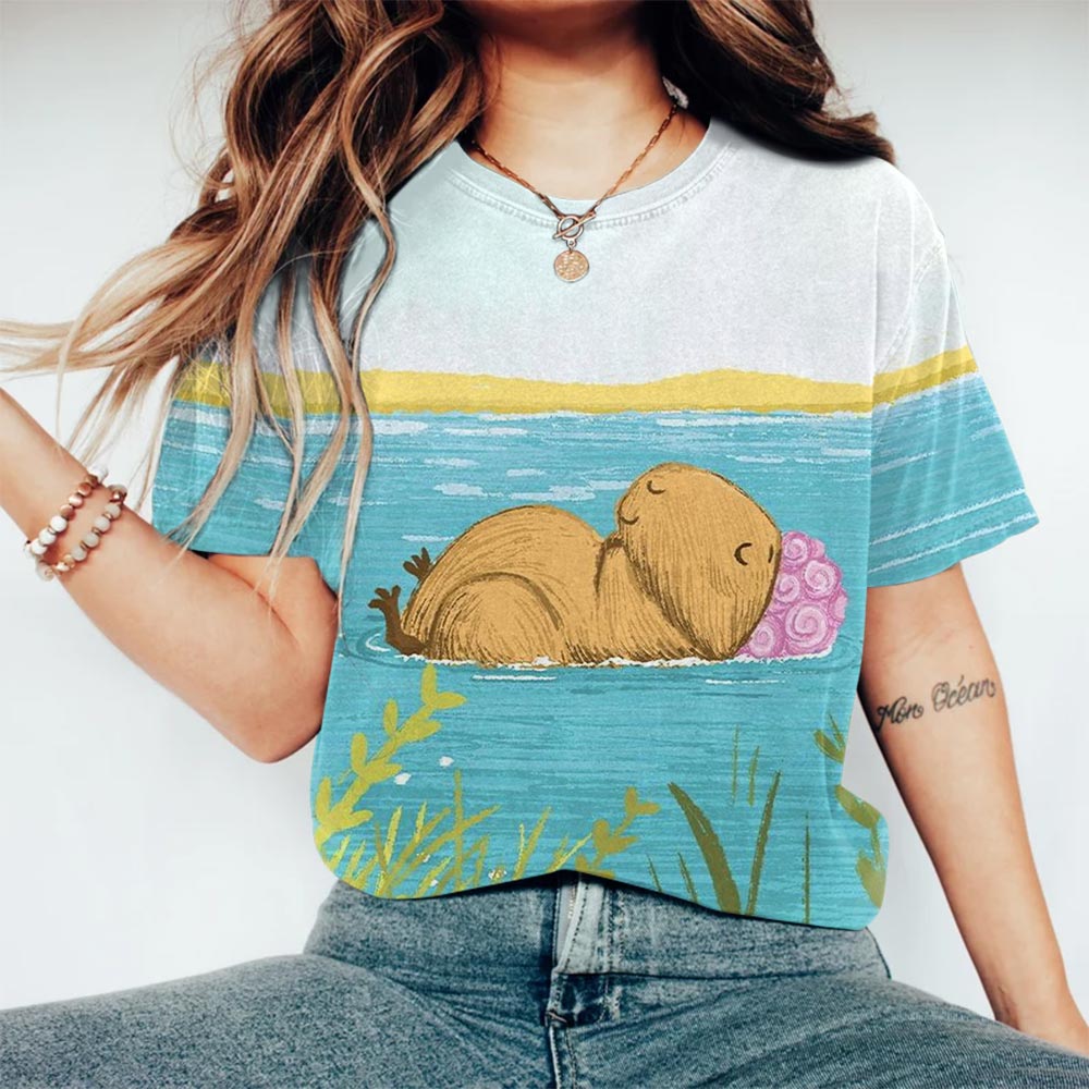 Dashingsoul Capybara Floating On The Lake Print Short Sleeve T-shirt