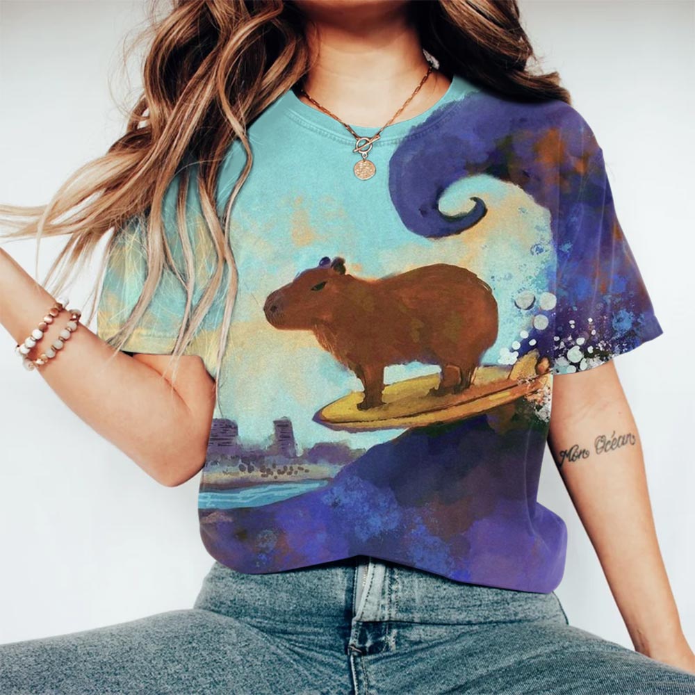 Dashingsoul Surfing Capybara Watercolor Print Short Sleeve T-shirt