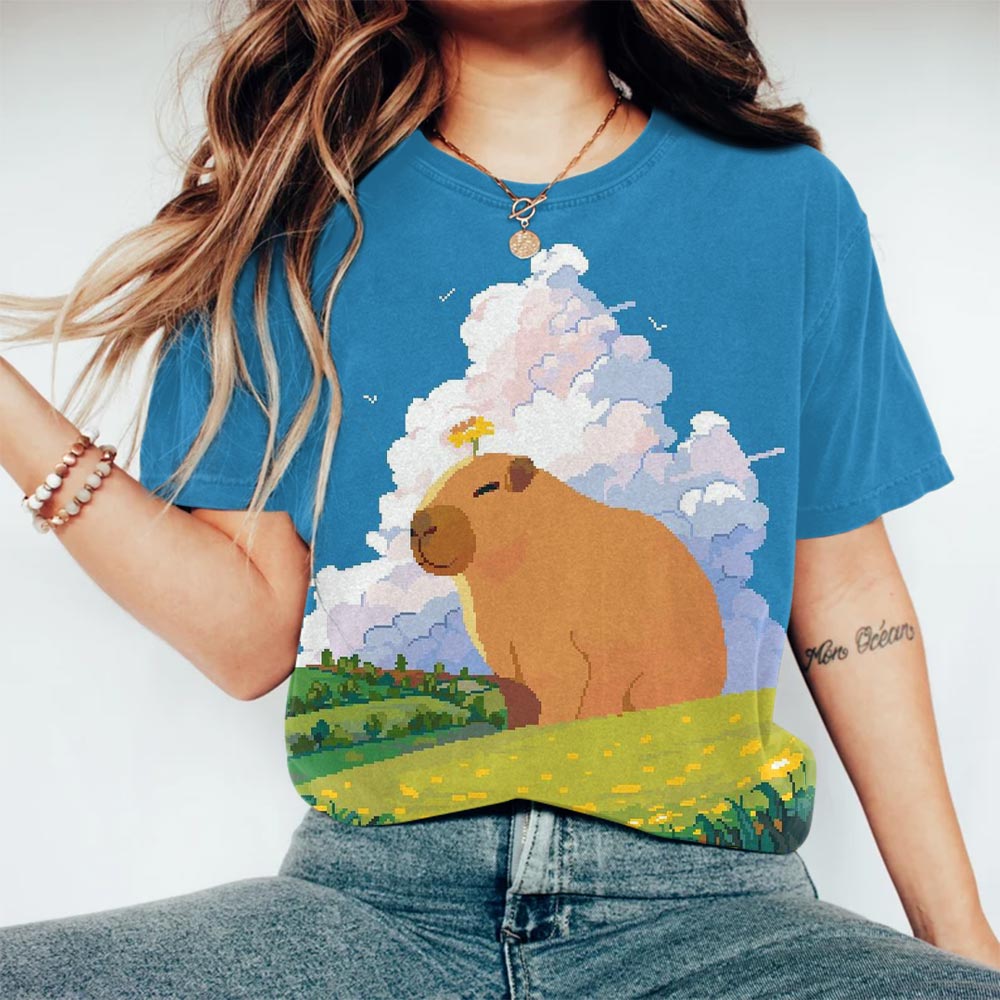 Dashingsoul Capybara Pixel Style In The Grassland Print Short Sleeve T-shirt