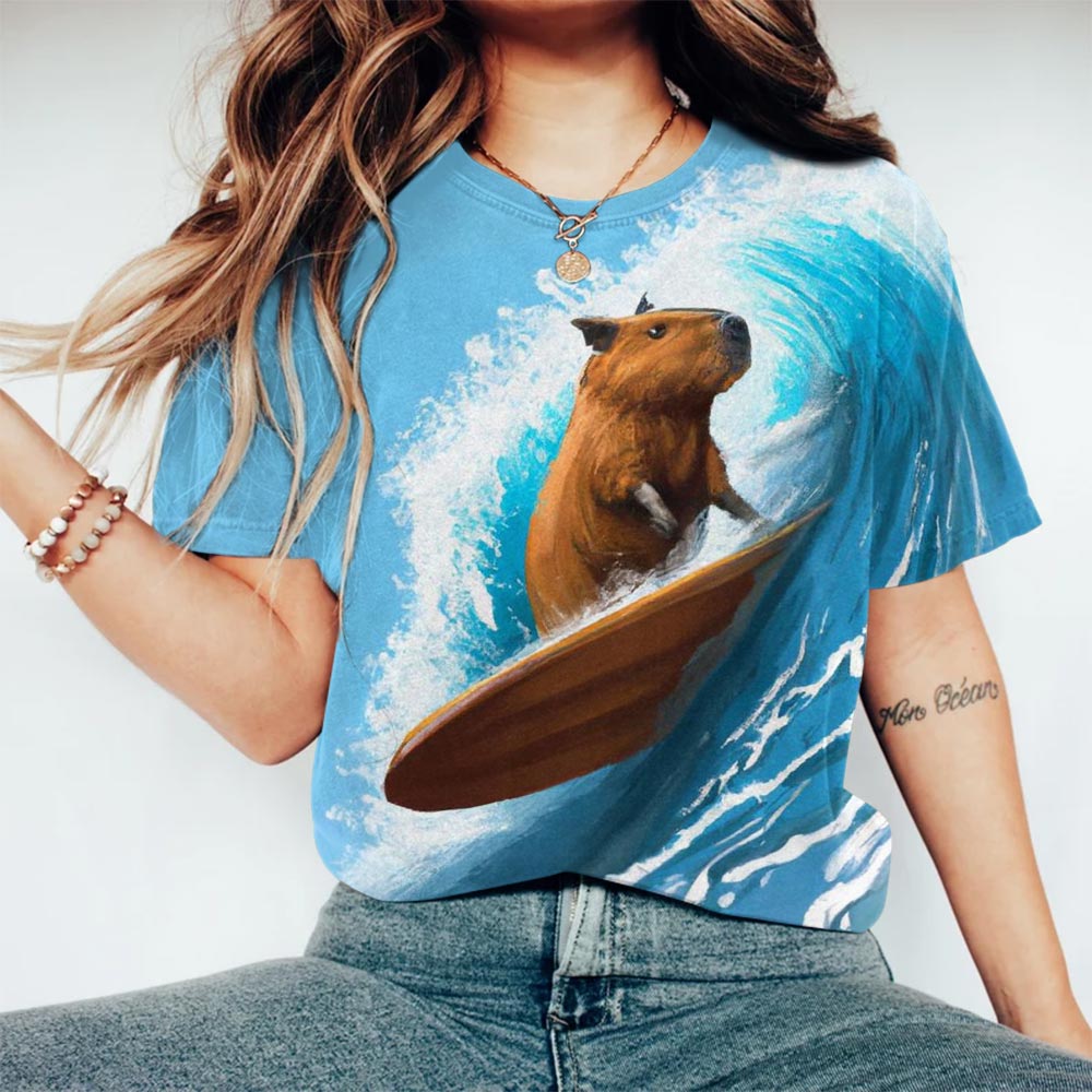 Dashingsoul Capybara Surfing Print Short Sleeve T-shirt