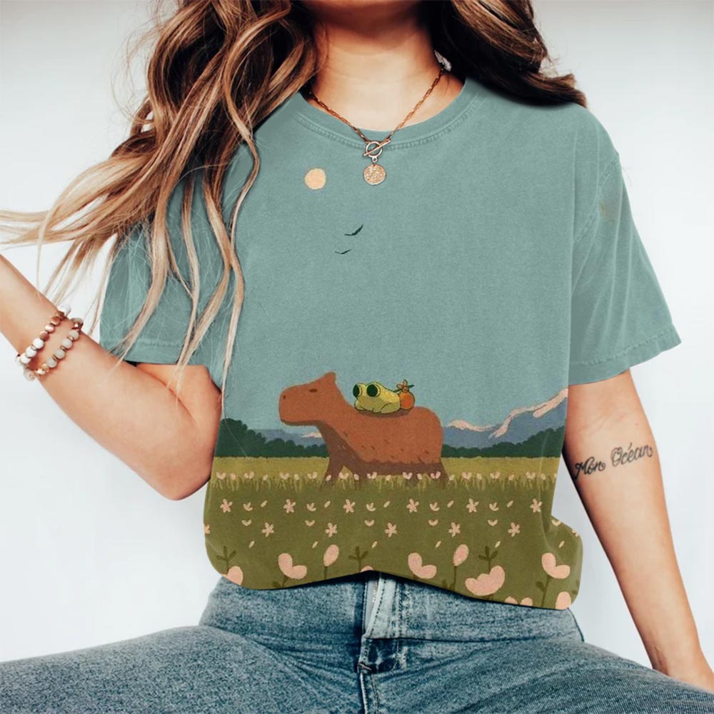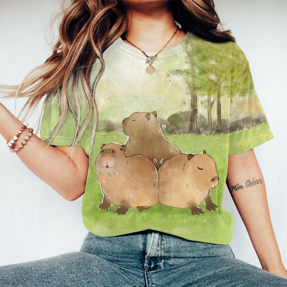 Dashingsoul Capybara On The Grassland Print Short Sleeve T-shirt