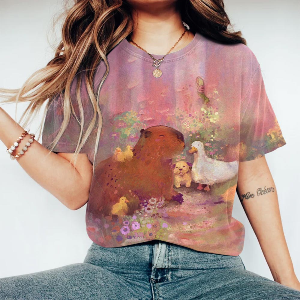 Dashingsoul Capybara In Flowers Print Short Sleeve T-shirt