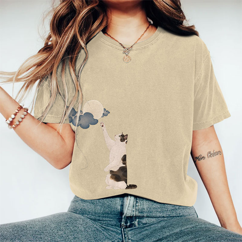 Dashingsoul Cotton Japanese Cat Scratched Moon Print T-shirt