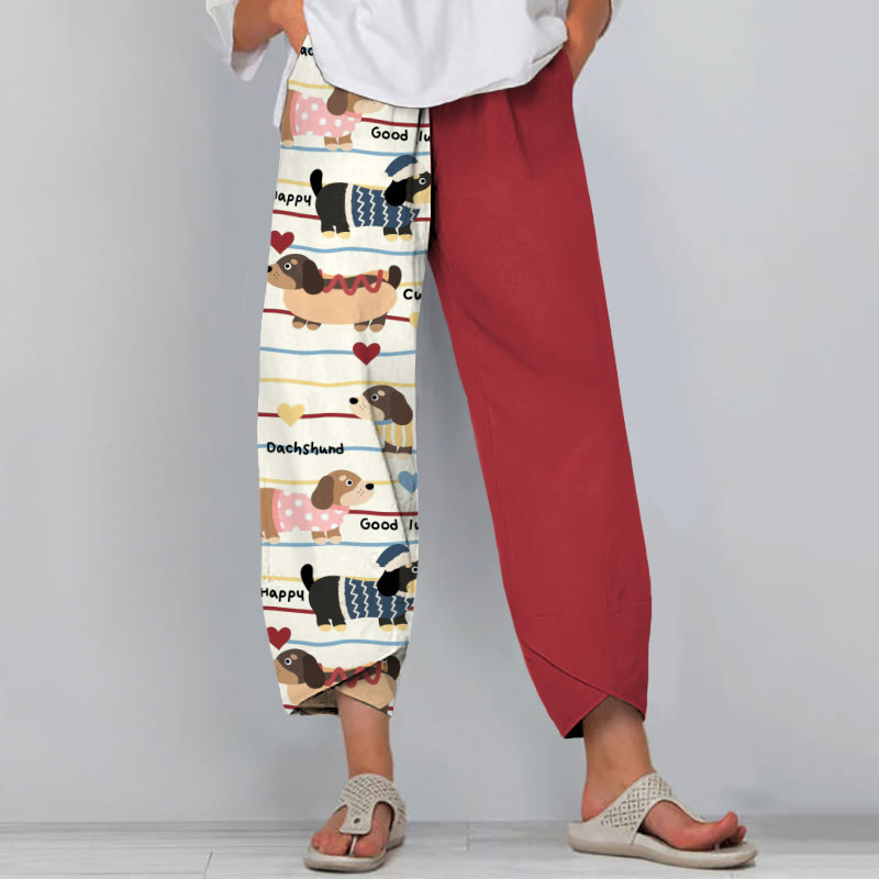 Dashingsoul Colorblock Striped Cartoon Dachshund Print Drawstring Pocket Women's Pants