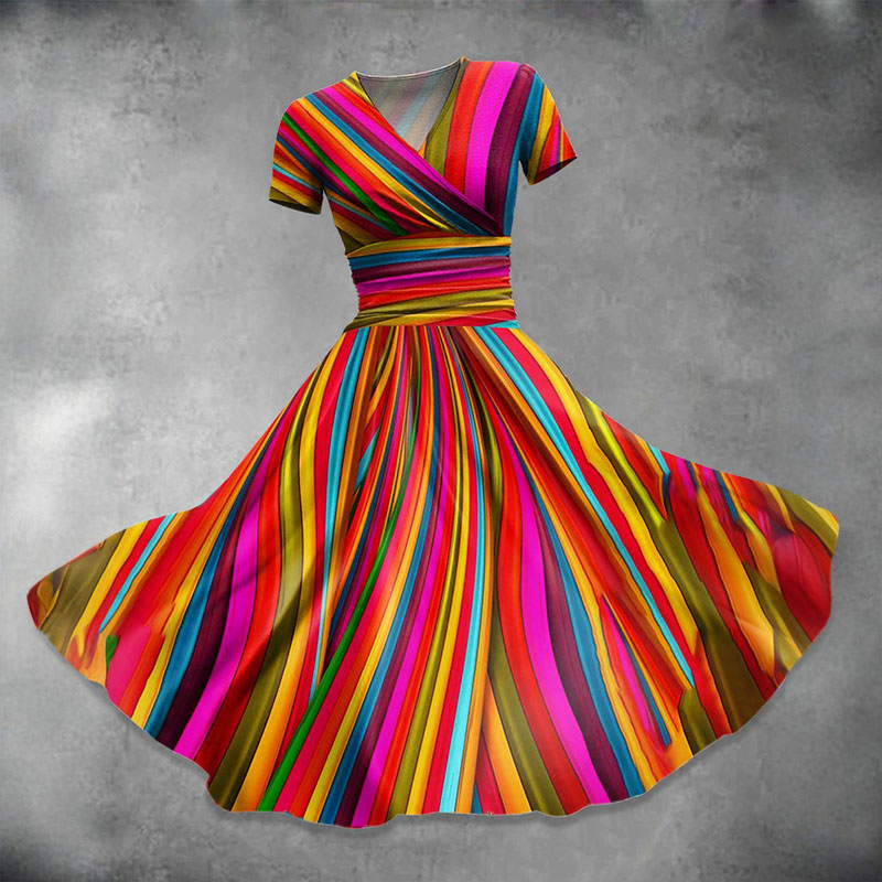 Dashingsoul Retro Rainbow Stripe Print Casual Midi Dress
