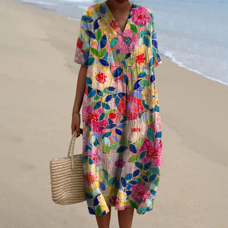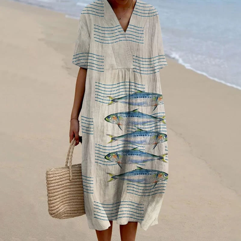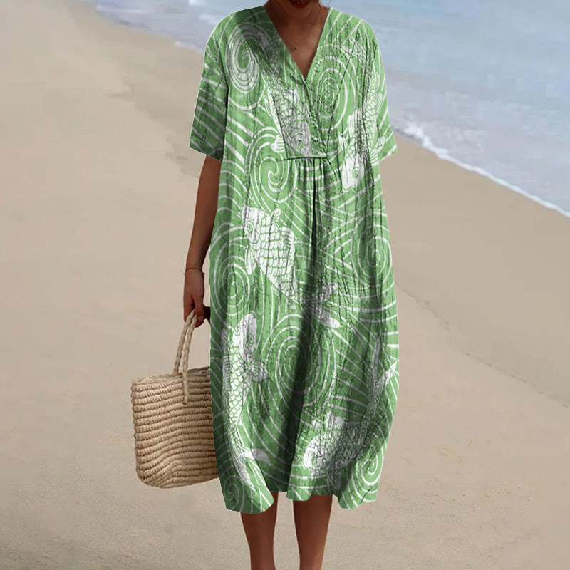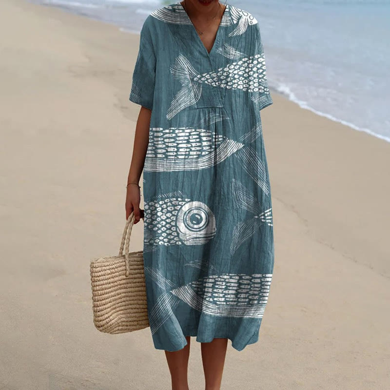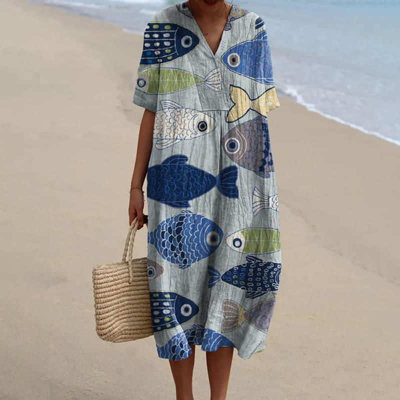 Women's Vintage Abstract Watercolor Fish School V-neck Short Sleeved Casual Midi Dress