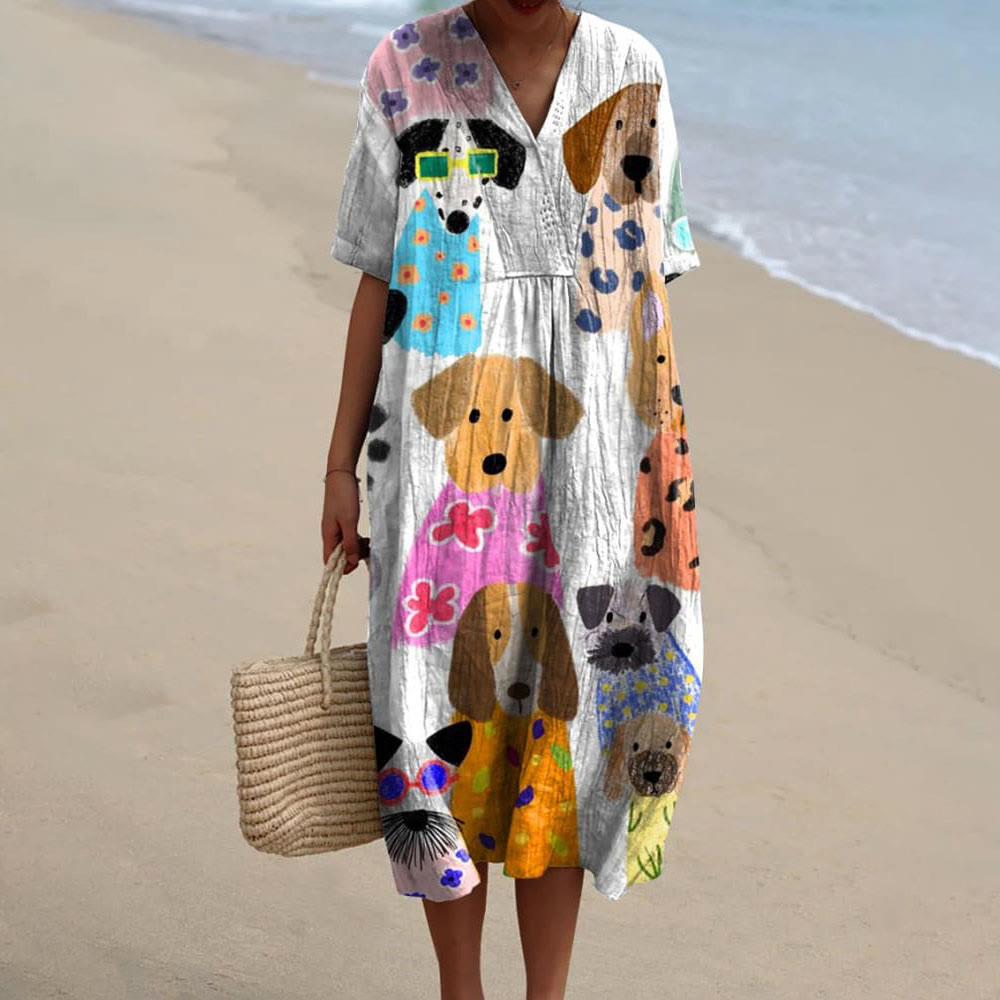 Dashingsoul Women's Multiple Cartoon Dogs Art Print Short-sleeved Midi Dress