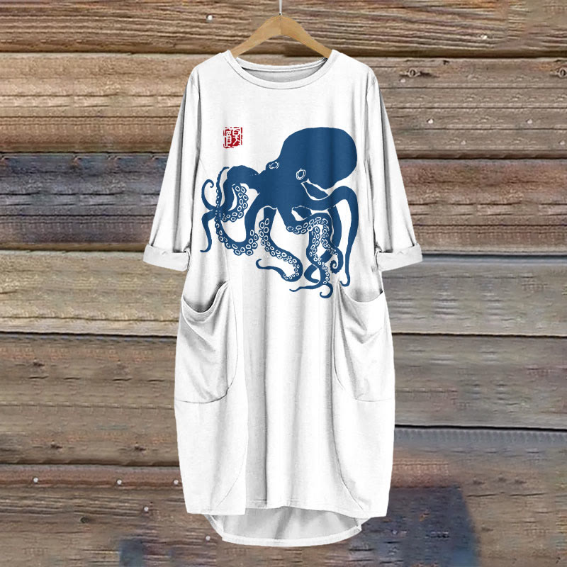 Dashingsoul Octopus Japanese Lino Art Vintage Print Crew Neck Casual Dress