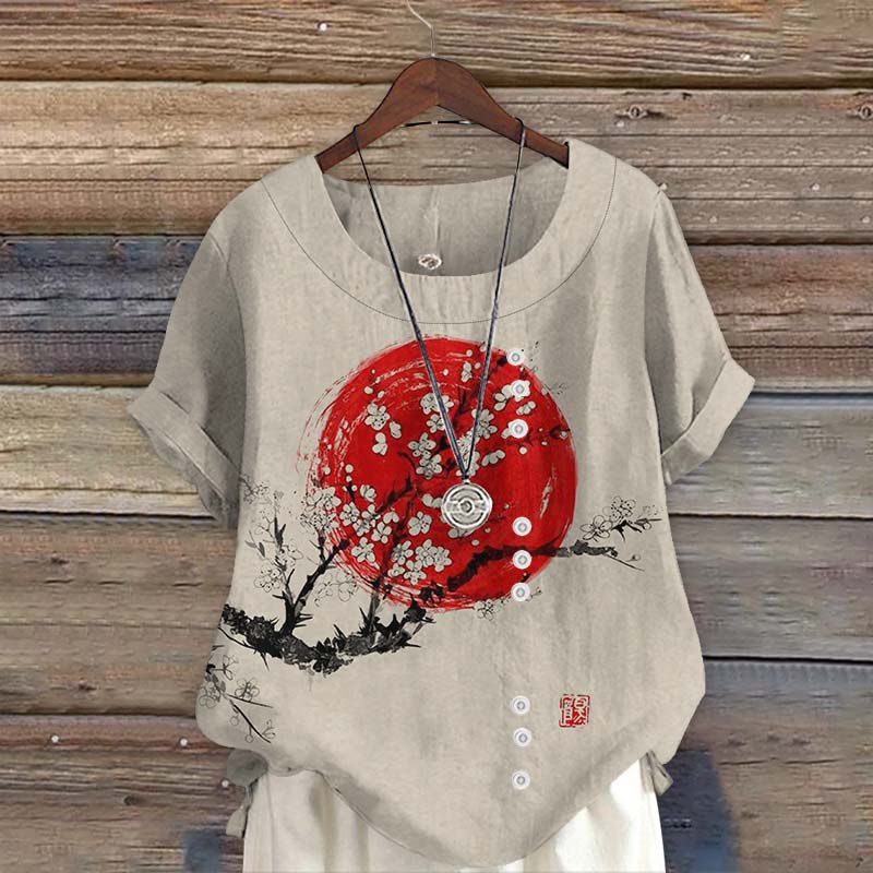 Dashingsoul Sunrise Plum Blossom Japanese Art Print Short Sleeve Blouse