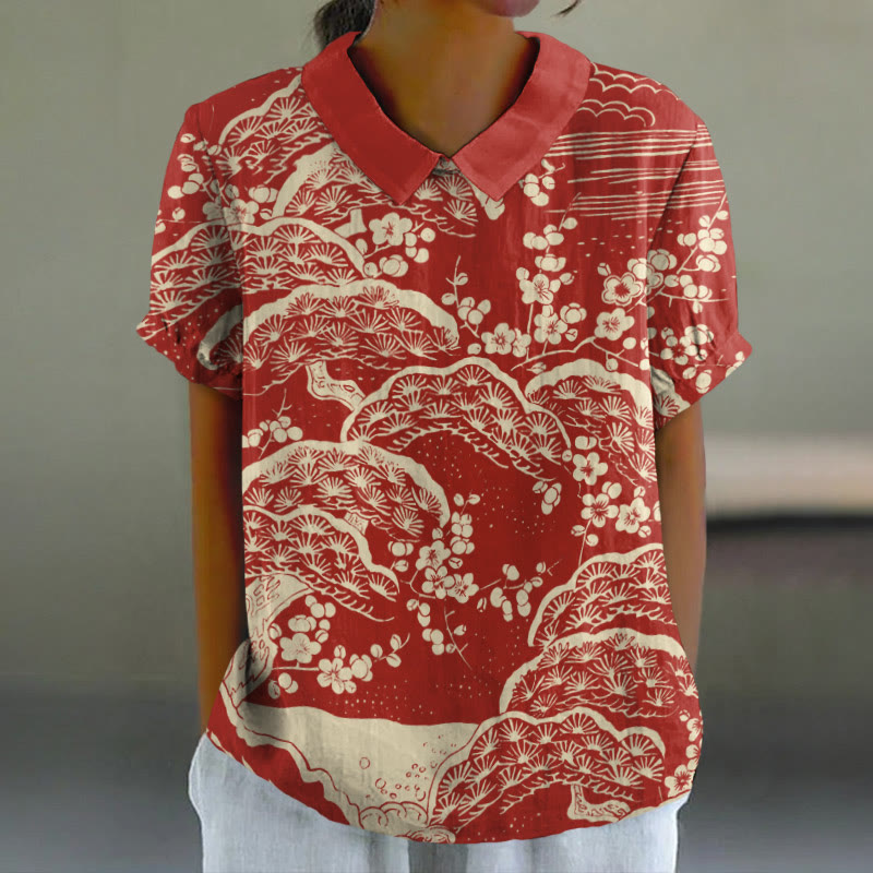 Dashingsoul Women's Japanese Art Plum Blossom Print Casual Lapel Loose Blouse