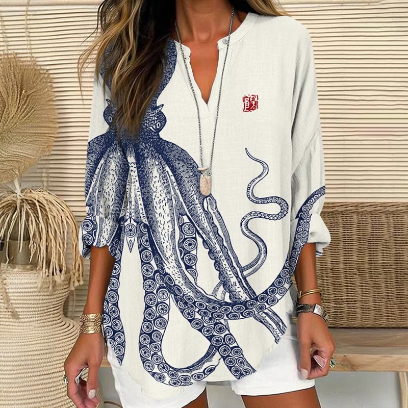 Japanese Art Octopus Graphic Print Casual V-neck Blouse
