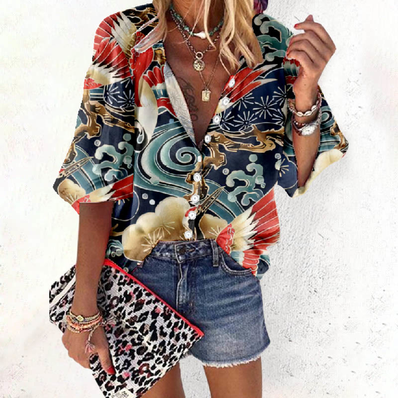 Japanese Style Floral Crane Print V-neck Half Sleeve Blouse