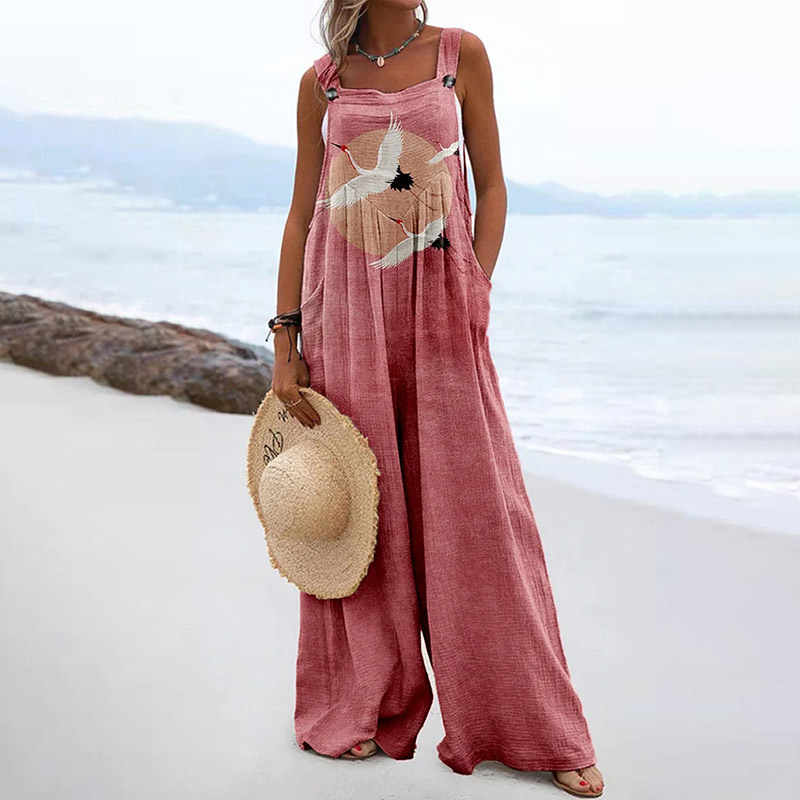 Dashingsoul Retro Cranes Japanese Art Print Wide Leg Jumpsuit