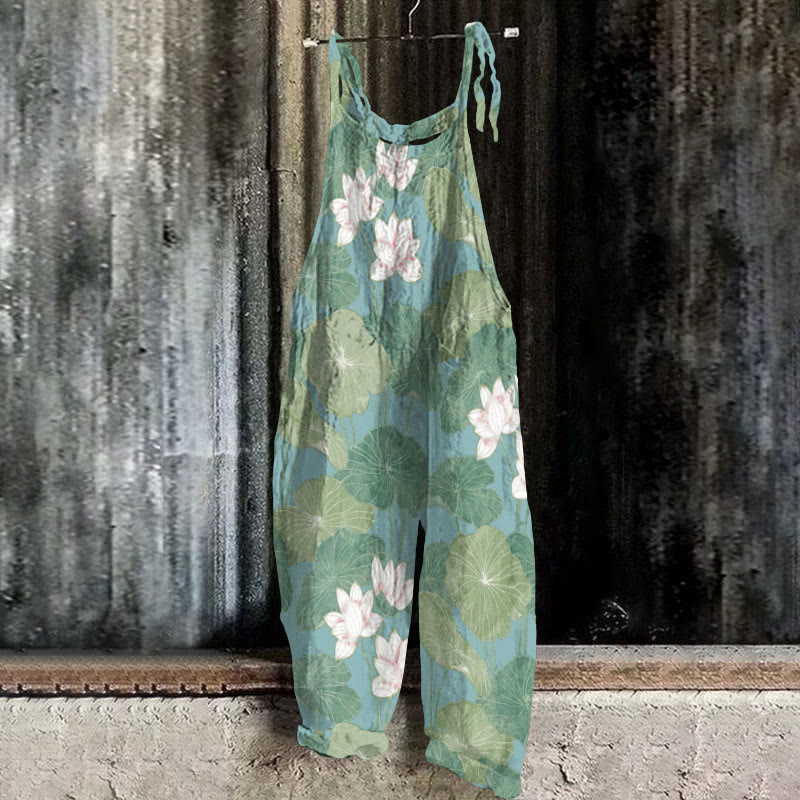 Women's Japanese Vintage Lotus Art Print Casual Jumpsuit