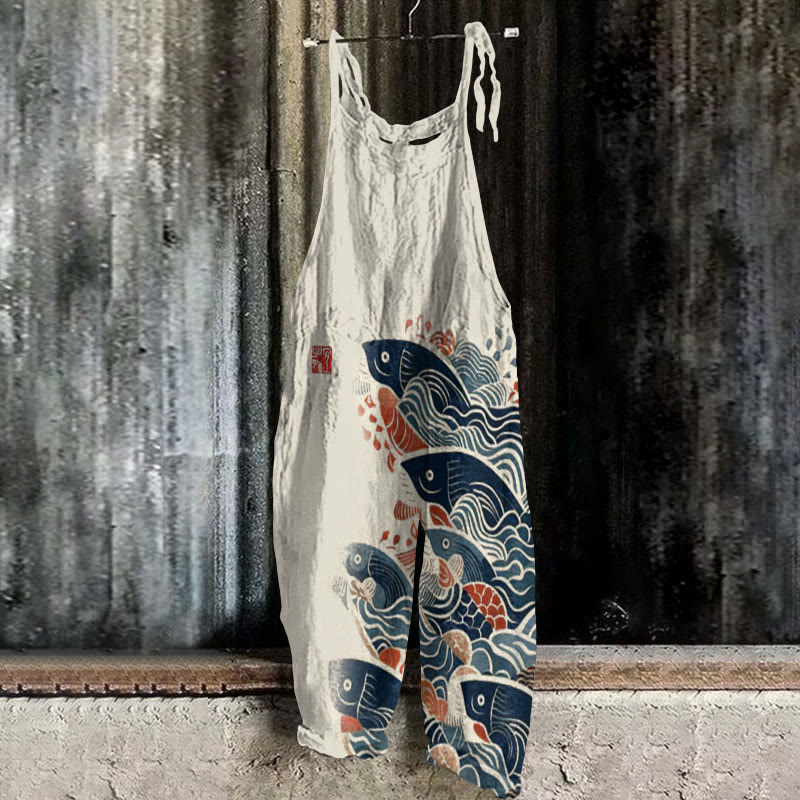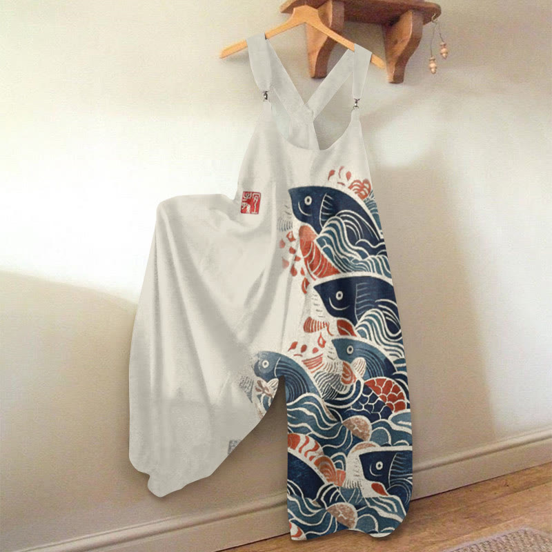 Dashingsoul Japanese Vintage Fish Art Print Casual Jumpsuit