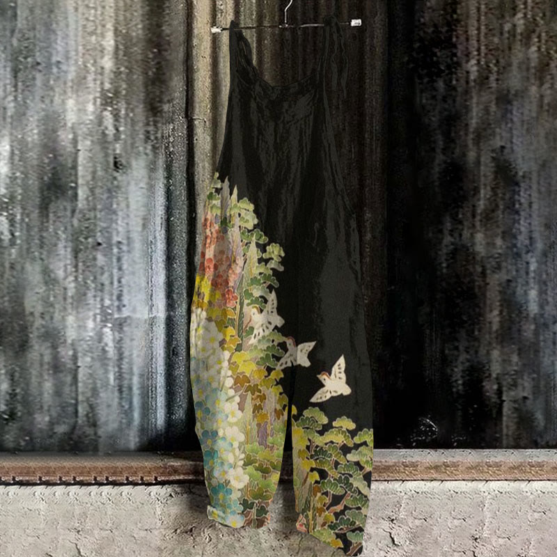 Dashingsoul Women's Oil Painting Chirping Crane Floral Print Jumpsuit