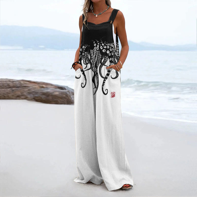 Vintage Oil Painting Octopus Print Casual Jumpsuit