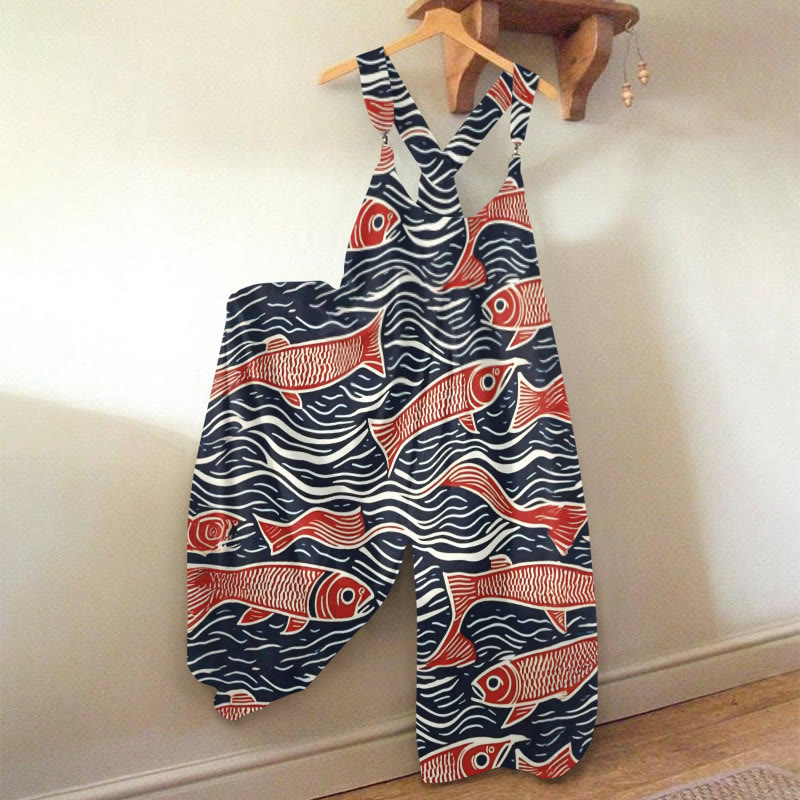 Fish Japanese Lino Art Print Casual Jumpsuit