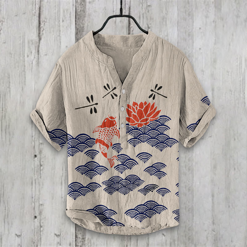Dashingsoul Japanese Style Koi Fish Dragonfly Wave Art Print Casual Shirt