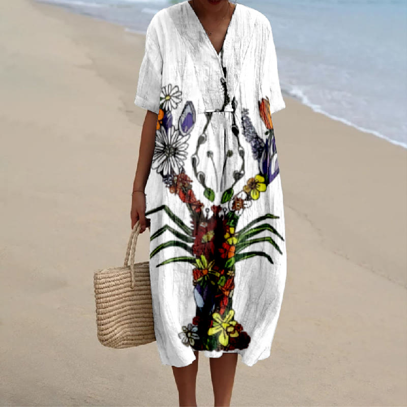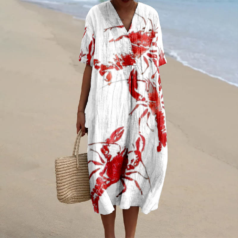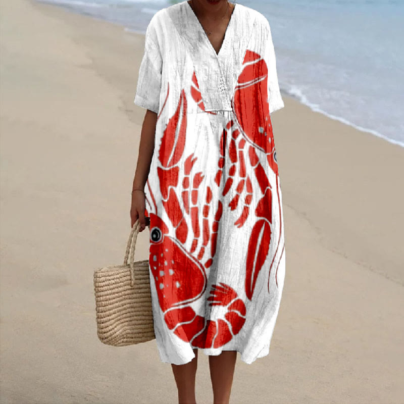 Japanese Lobster Art Print V-neck Short Sleeved Casual Midi Dress