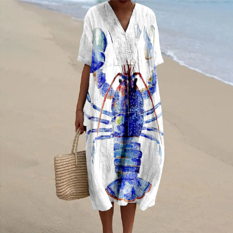 Dashingsoul Women's Vivid Big Blue Lobster Art Print V-neck Short Sleeved Casual Midi Dress