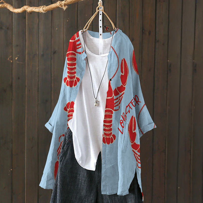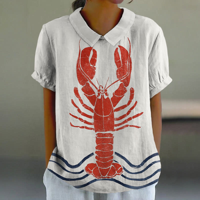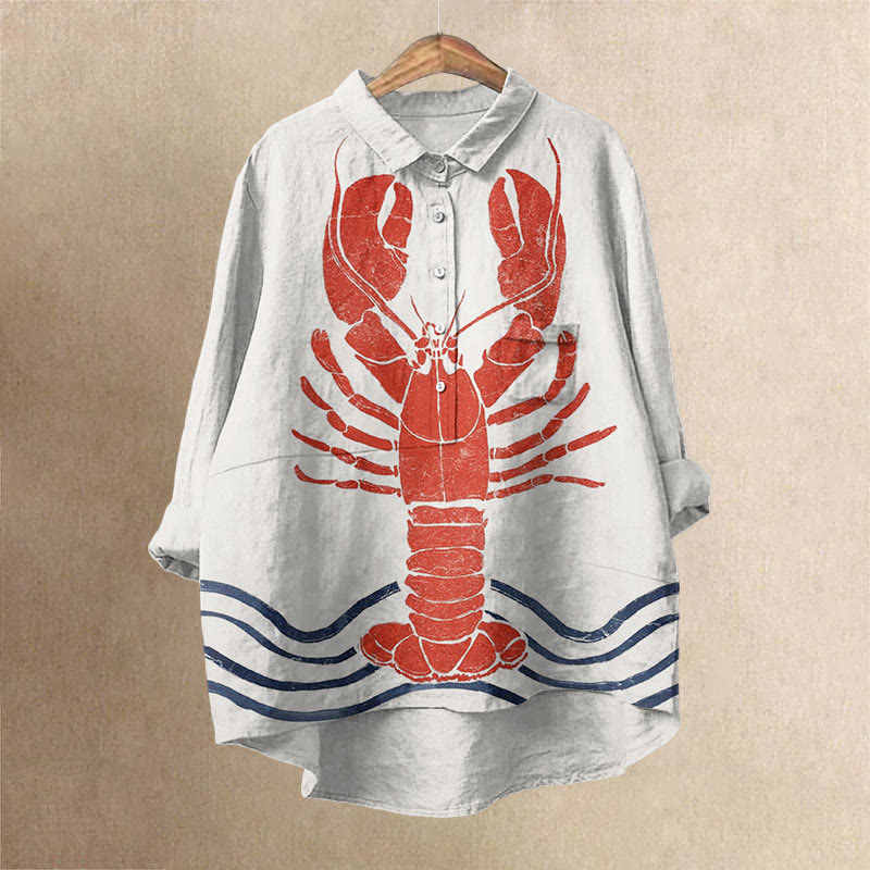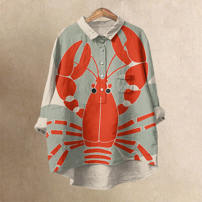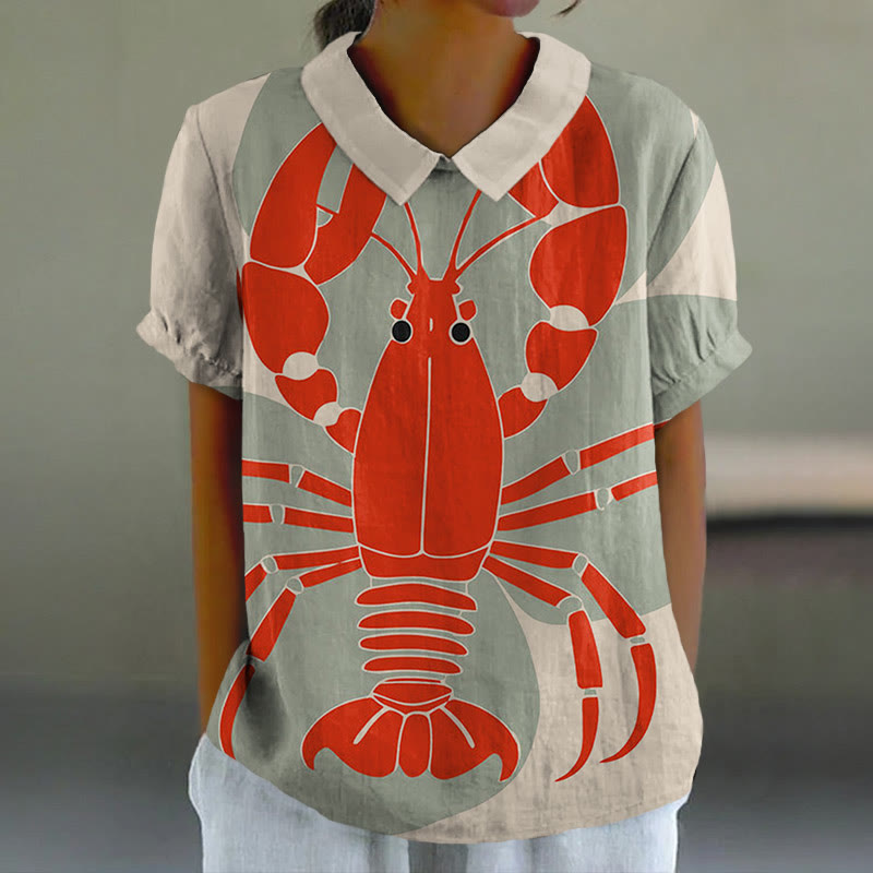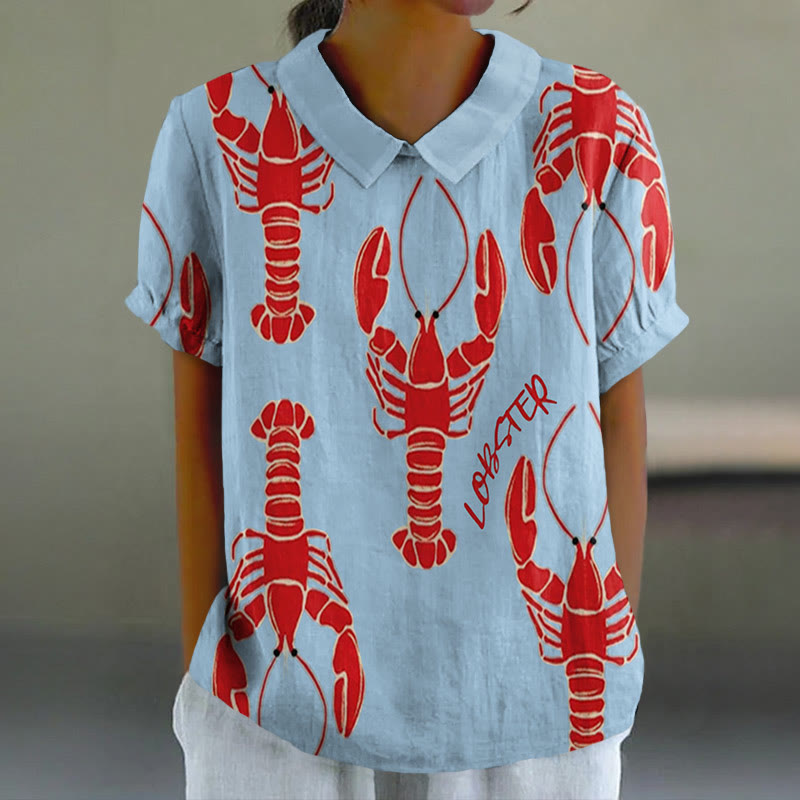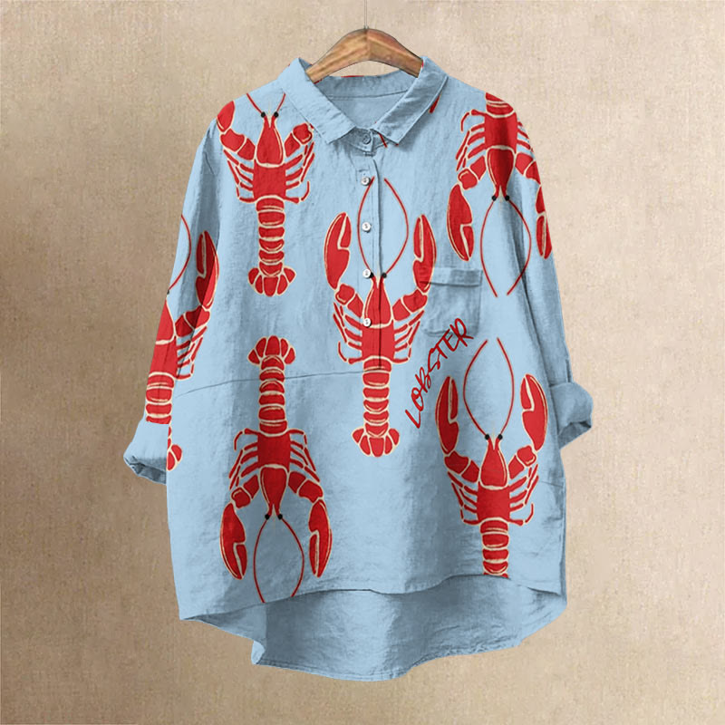 Dashingsoul Women's Vintage Lobster Art Print Casual Lapel Blouse