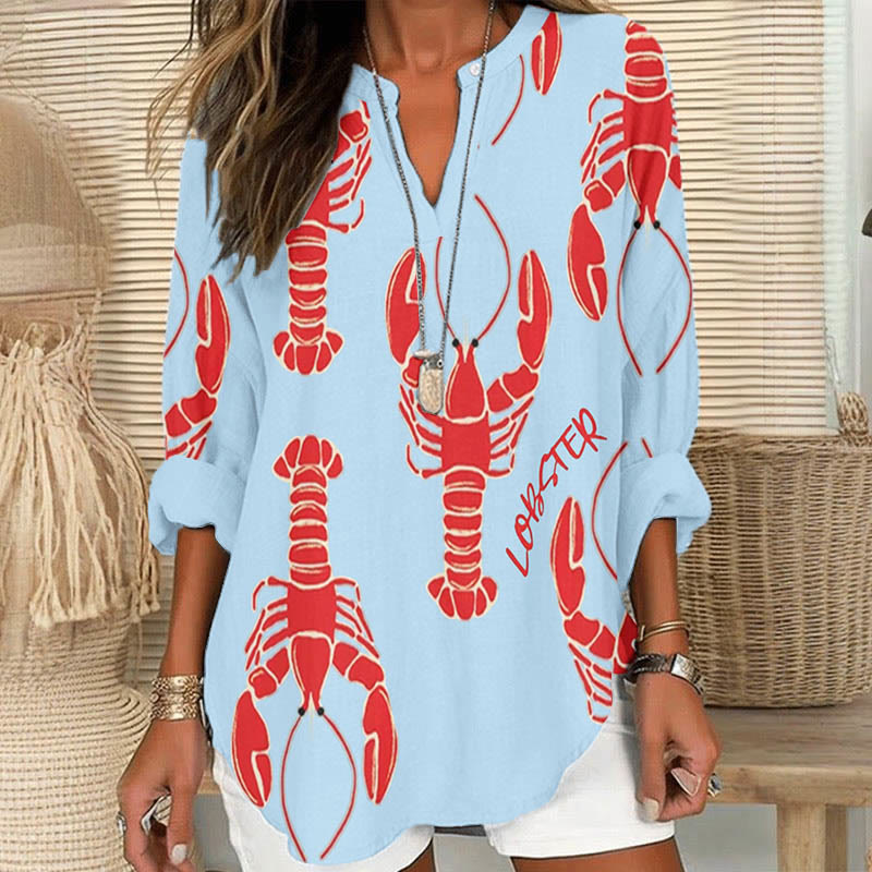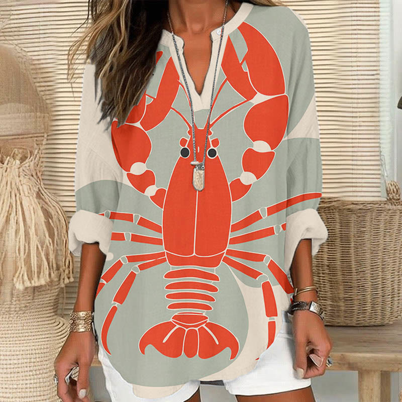 Dashingsoul Women's Vintage Lobster Art Print V Neck Long Sleeve Blouse