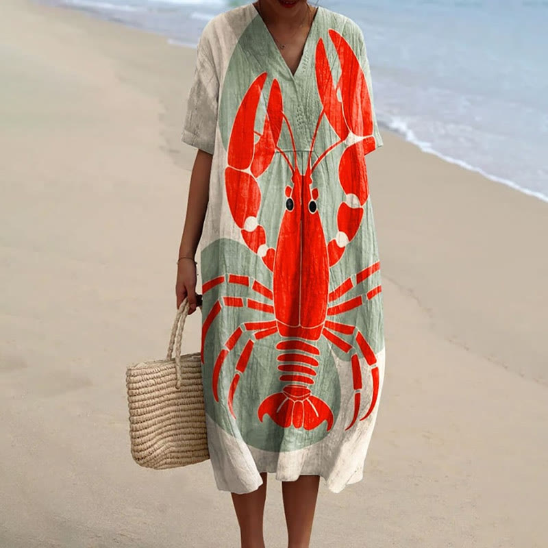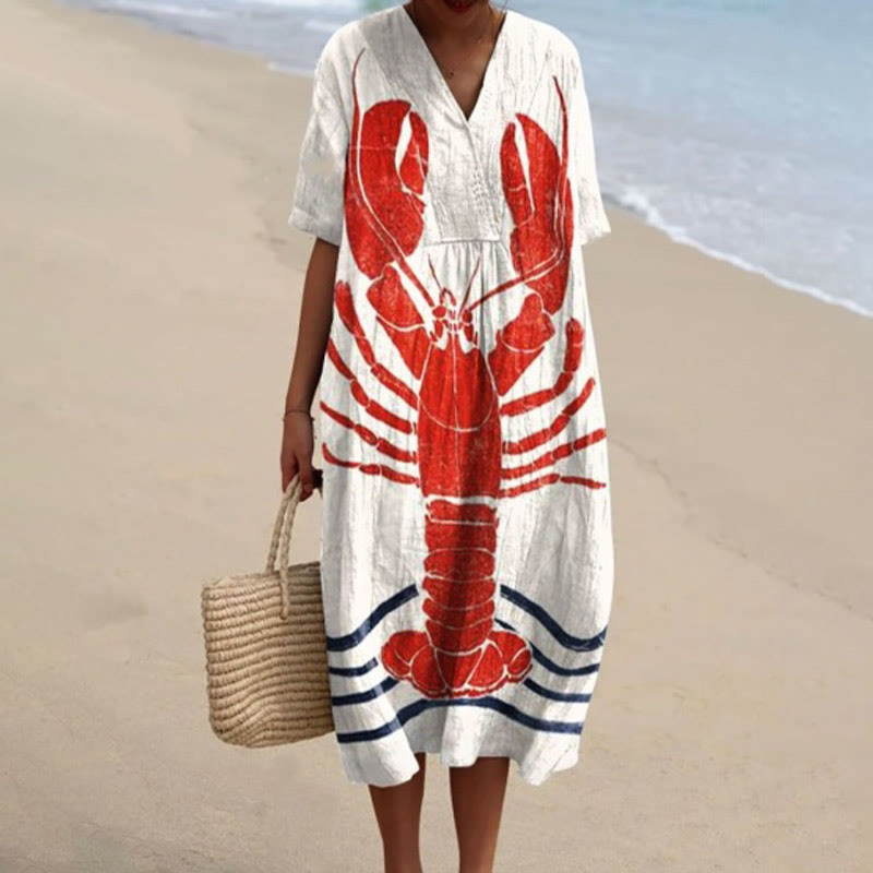 Women's Summer Simple Lobster Pattern Art Print Short-sleeved Midi Dress
