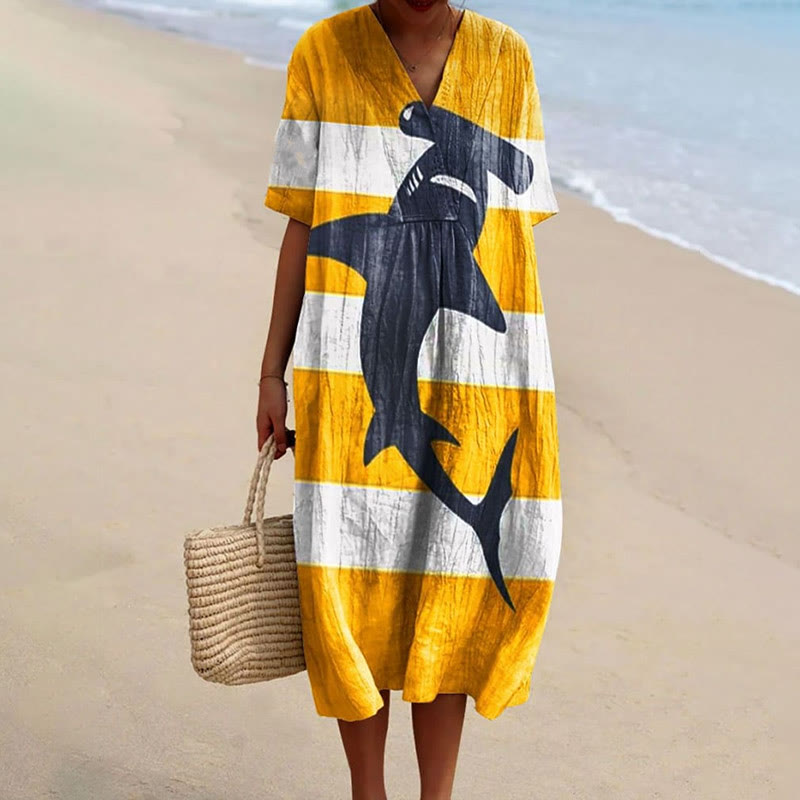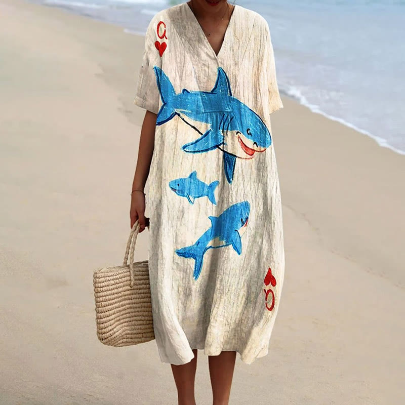 Dashingsoul Women's Vintage Cute Ocean Sharks Art Print Short-sleeved Midi Dress