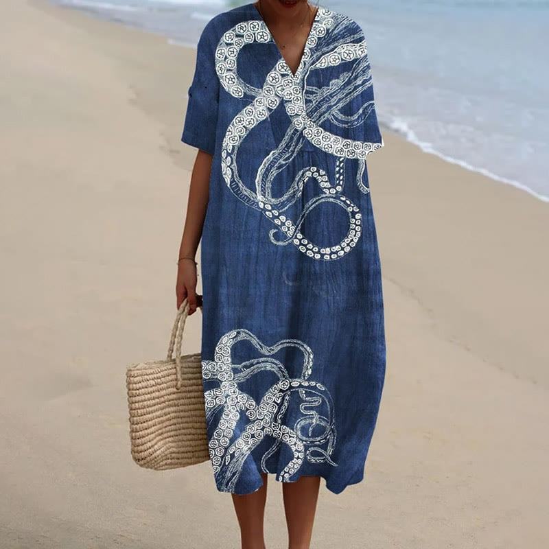 Women's Vintage Abstract Octopus Tentacles Art Printed Short-sleeved Midi Dress