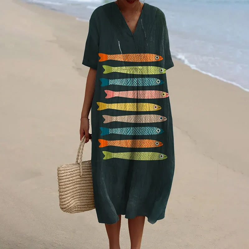 Dashingsoul Women's Vintage Colorful Fish Art Print Short-sleeved Midi Dress