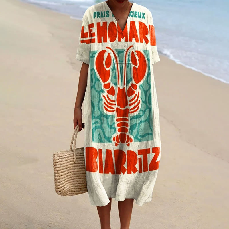 Dashingsoul Women's Vintage French Biarritz Lobster Art Print Short-sleeved Midi Dress