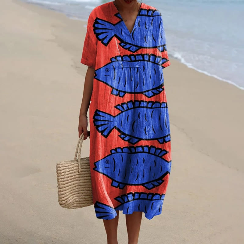 Dashingsoul Women's Swimming Fish Art Print Short-sleeved Midi Dress