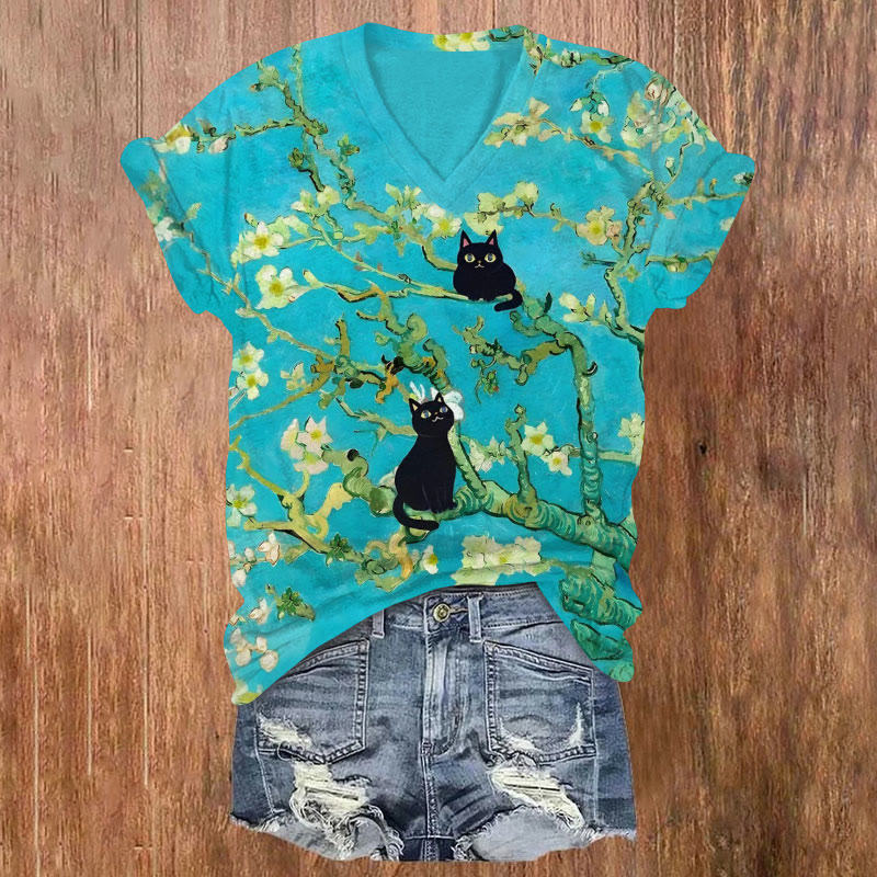 Dashingsoul Van Gogh Almond Blossoms Cat Art Print V-neck T-shirt