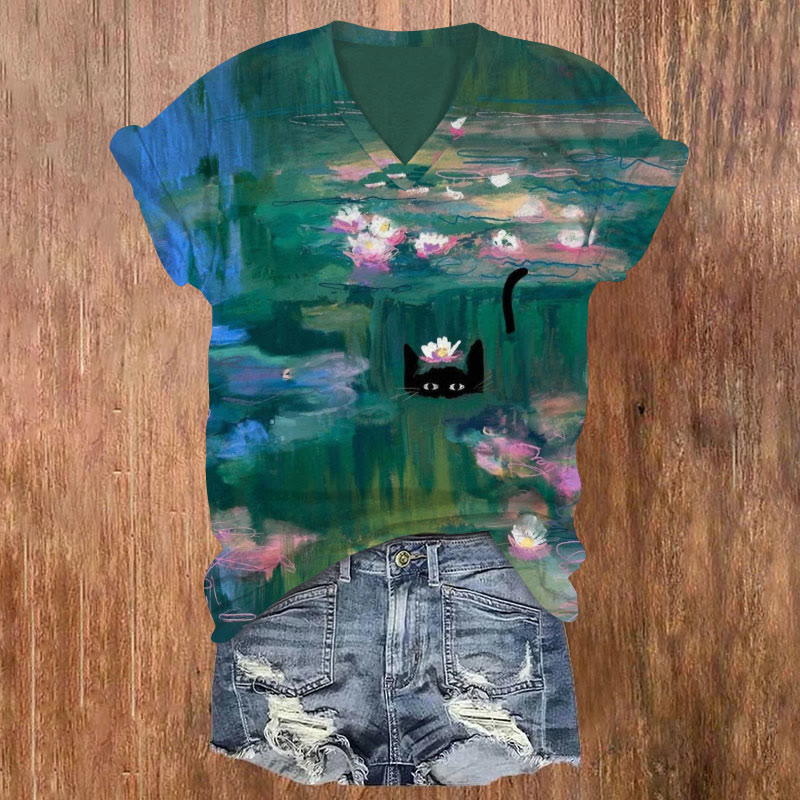 Dashingsoul Funny Black Cat In Claude Monet's Waterlily Painting Art Print V-neck T-shirt
