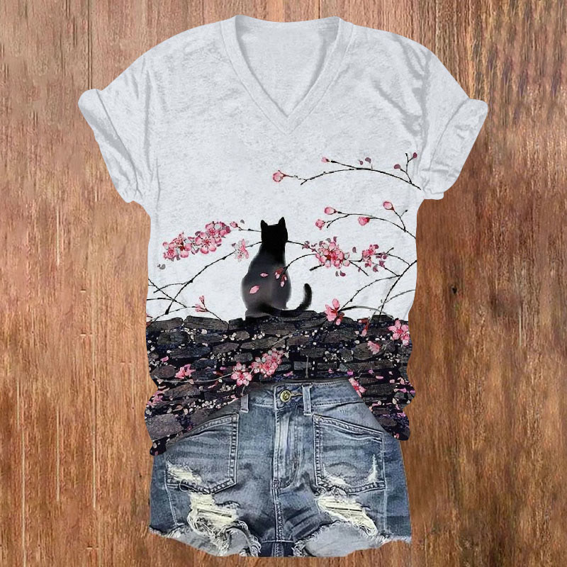 Dashingsoul Japanese Style Plum Cat Ink Painting Art Print Short Sleeve V-neck T-shirt