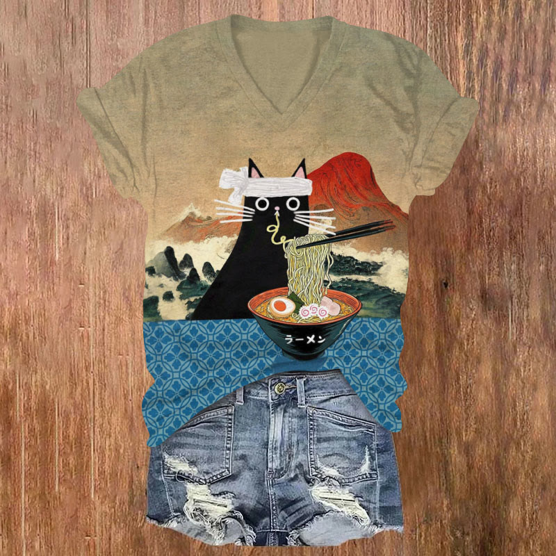 Dashingsoul Funny Japanese Black Cat Eating Ramen Print V-neck T-shirt