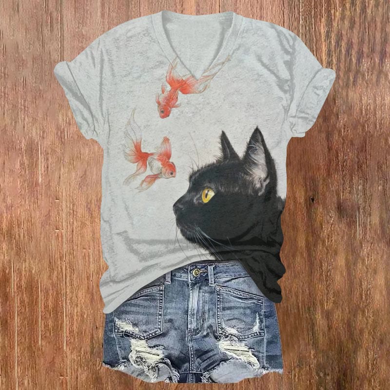 Dashingsoul Cute Black Cat And Goldfish Print Casual V-neck T-shirt