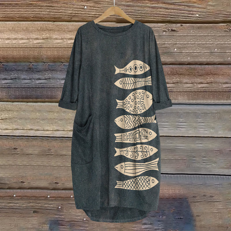 Dashingsoul Fish Japanese Lino Art Print Crew Neck Casual Dress