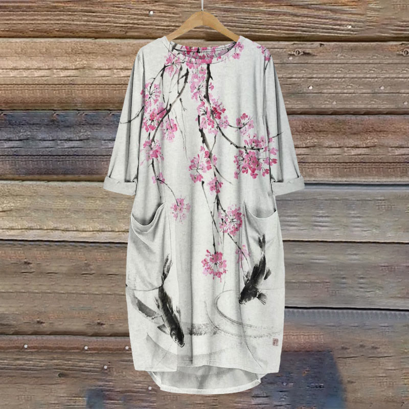 Dashingsoul Japanese Koi & Cherry Blossom Art Print Crew Neck Casual Dress