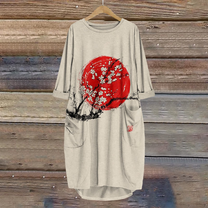 Dashingsoul Sunrise Plum Blossom Japanese Art Print Crew Neck Casual Dress