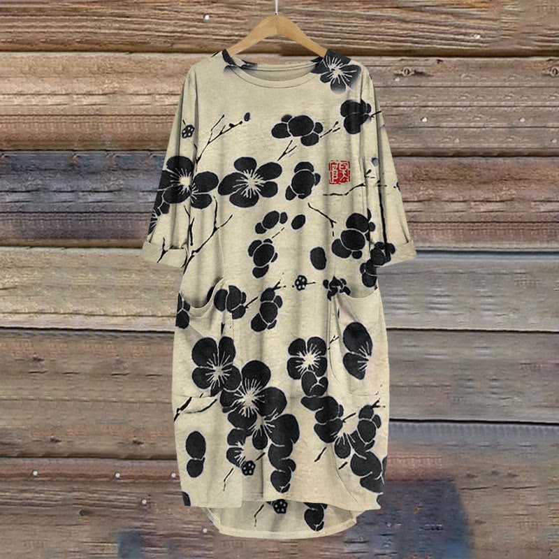 Dashingsoul Cherry Blossom Japanese Lino Art Vintage Print Crew Neck Casual Dress