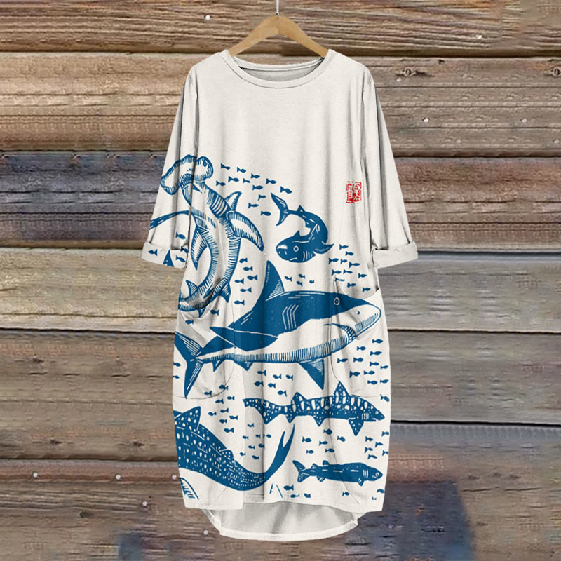 Dashingsoul Sharks Japanese Lino Art Print Crew Neck Casual Dress