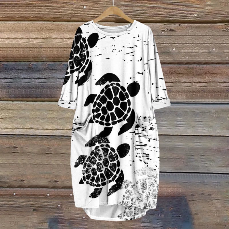 Dashingsoul Ocean Turtle Lino Art Print Crew Neck Casual Dress