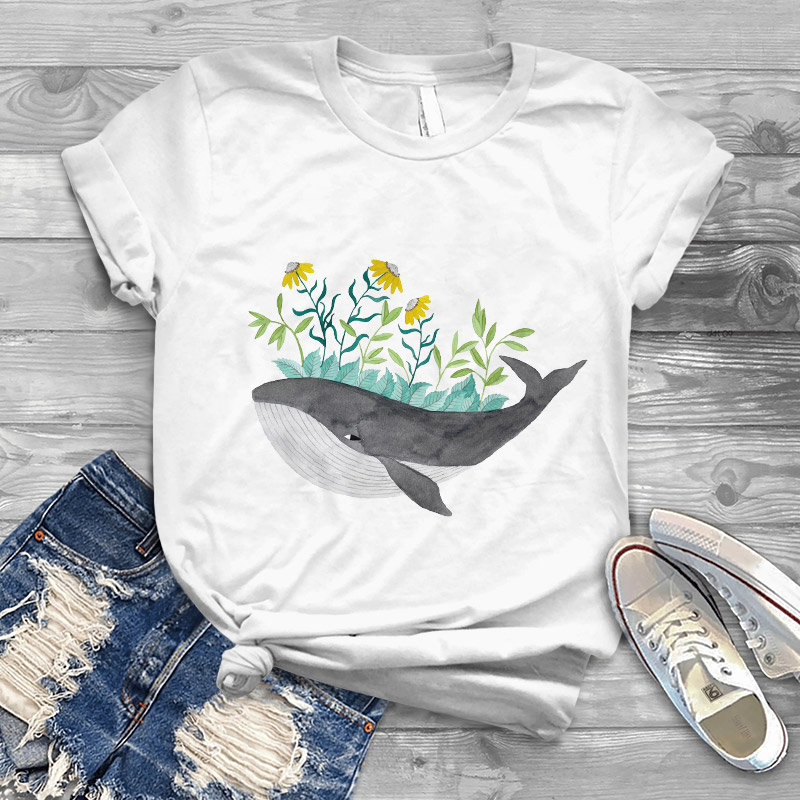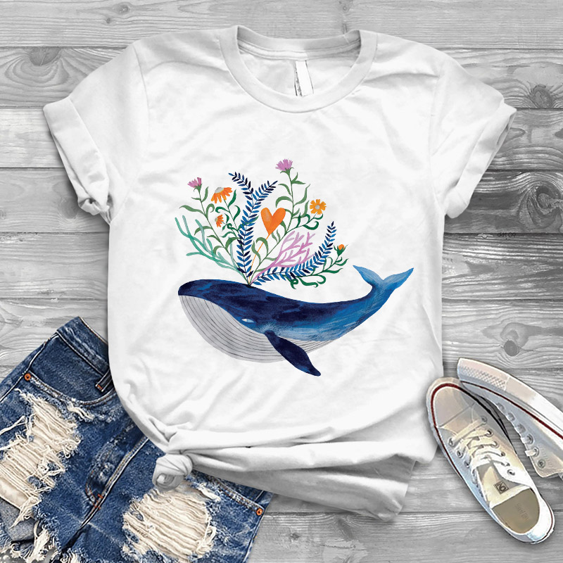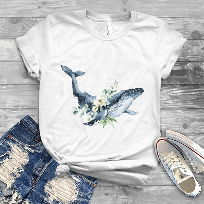 Dashingsoul Women's Graceful Blue Whale And Floral Print Casual T-shirt