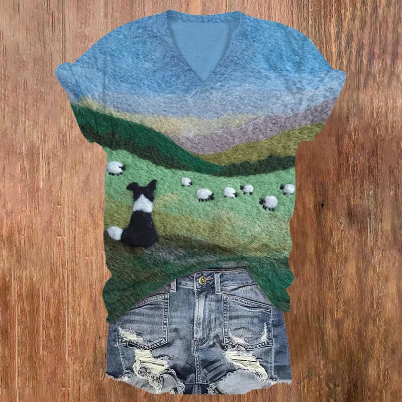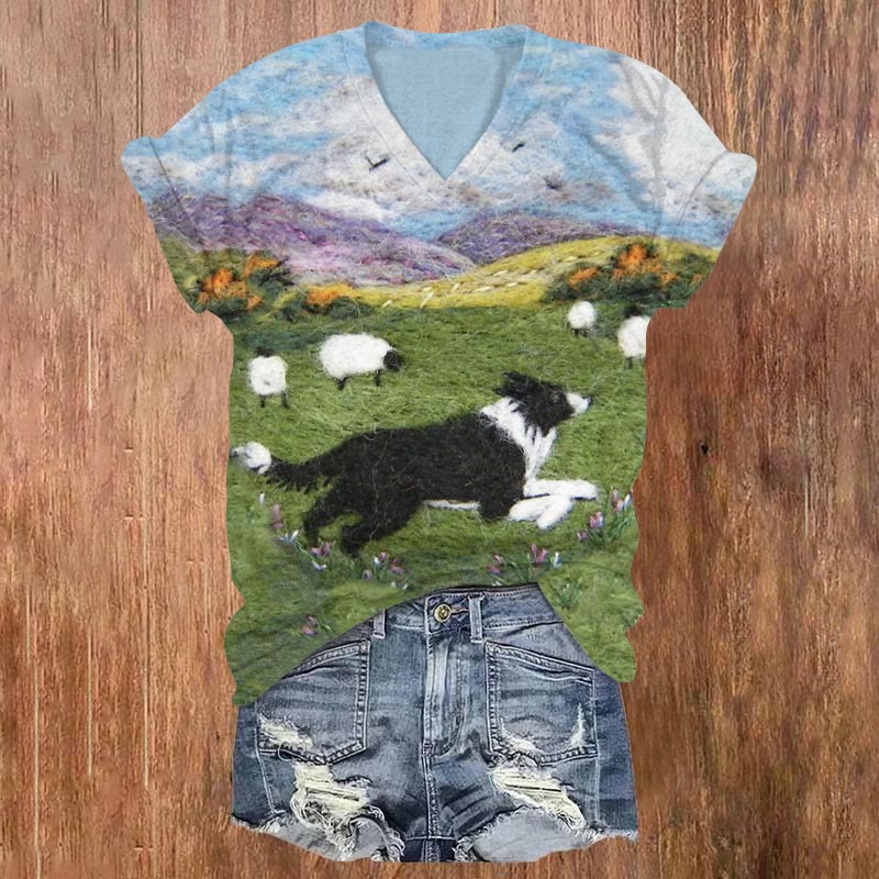 Dashingsoul Sheepdog Watching Sheep On The Grassland Print V-neck Short Sleeved T-shirt