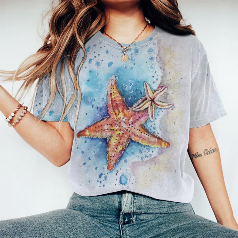 Dashingsoul Starfish Watercolor Print Crew Neck T-shirt